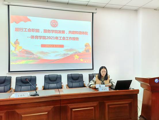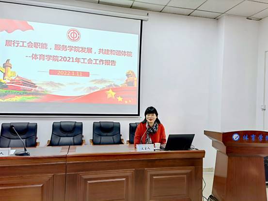 副院长兼院分工会主席潘红玲以《履行工会职能,服务学院发展,共建和谐体院》为主题作体育学院分工会工作报告,潘红玲指出,一年来分工会围绕中心服务大局,在推进师德师风建设、加强民主管理与民主监督、服务教职工所需,营造和谐氛围等方面充分发挥职能作用,今后将坚定不移走中国特色社会主义工会发展道路,充分发挥教代会、工会在组织动员群众、教育引导群众、联系服务群众和维护群众合法权益中的作用,凝心聚力,为学院高质量发展营造一个民主、法治、和谐的校园环境而奋斗。