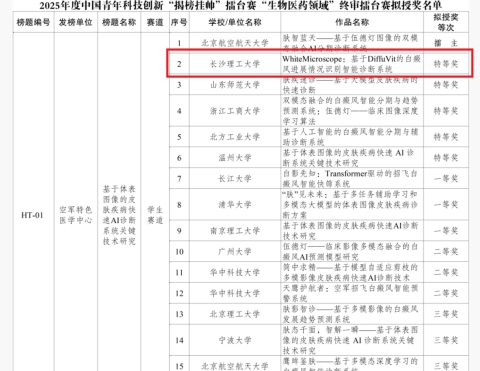 在近日落幕的2025年度中国青年科技创新“揭榜挂帅”擂台赛中,我院王新、王威老师带领的学生团队凭借“WhiteMicroscope:基于DiffuVit的白癜风进展情况识别智能诊断系统”,在清华大学、华中科技大学等全国顶尖高校组成的279支队伍中脱颖而出,成功斩获“生物医药领域”主擂台赛特等奖,这也是MG冰球官网首次获得挑战杯“揭榜挂帅”赛道特等奖,以实际成果展现了学校创新人才培养的扎实成效。