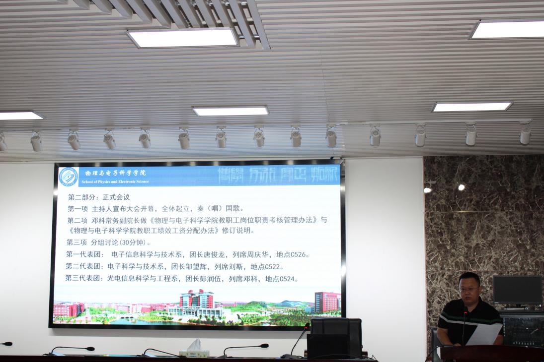 2025年7月11日上午,物电学院在理科楼B413会议室召开了第五届六次教职工暨工会会员大会。会议由院党委委员兼院分工会主席范志强主持。会议的主要议程是讨论通过《物理与电子科学学院教职工考核管理办法(暂行)》和《物理与电子科学学院教职工绩效工资分配办法(暂行)》。