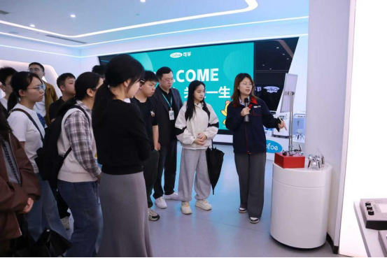 在可孚医疗工作人员的引导下,师生们首先参观了生产园区的产品展示厅。厅内陈列的一系列高科技产品,集中展现了企业最新科研成果,直观呈现了可孚医疗在研发与产品领域的深厚实力。随后,师生们走进自动化生产车间,实地观摩了关键零部件生产、成品装配、包装等全流程,各环节已基本实现自动化作业,生产高效有序。最后,大家前往公司运营总部,参观了总部展厅与日常办公区,实地了解了直播运营、电商中心等一线业务板块的工作场景,对企业的实际运作模式形成了更具体、直观的认识。