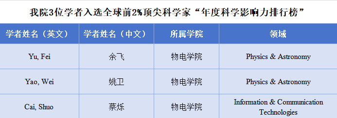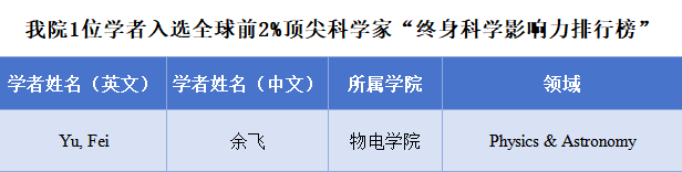 近日,斯坦福大学与国际知名学术出版机构爱思唯尔数据库(Elsevier Data Repository)联合公布了2025年度“全球前2%顶尖科学家榜单”(World's Top 2% Scientists)。在该榜单中,我院余飞副教授荣登“终身科学影响力排行榜”;余飞副教授、姚卫博士及蔡烁教授三人共同入选“2025年度科学影响力排行榜”。
