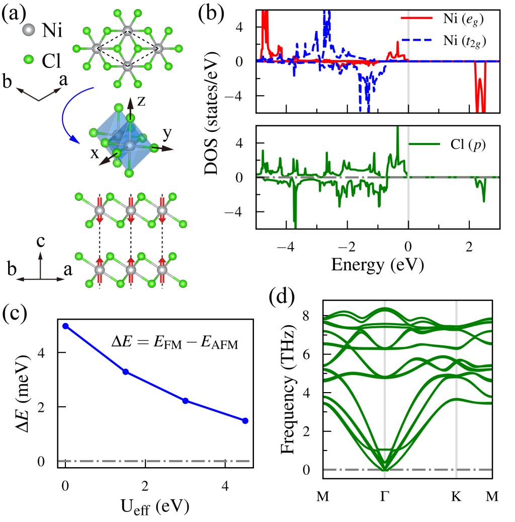 图2 1T-NiCl2的晶体结构、态密度、磁基态和声子谱