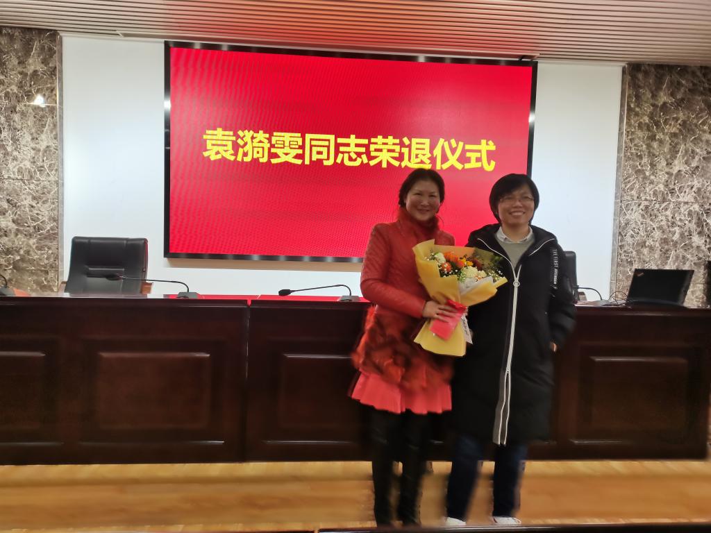 副院长兼分工会主席刘斯代表学院全体老师向袁漪雯老师献上鲜花和祝福。袁漪雯老师非常感动,现场发表感言,努力工作38年今天终于光荣退休了,感谢学校和学院的关心和关爱,对工作和同事有一种不舍的感情。