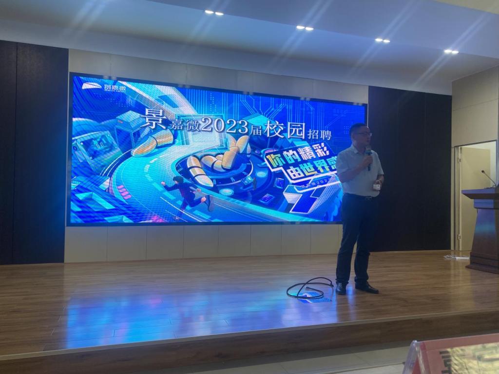 接着,景嘉微副总裁胡亚华上台讲话。胡总向同学们介绍了景嘉微的发展历程及技术成果等。胡总提到,从以前依赖国外GPU技术走向现在国内自主研发出自己的GPU,景嘉微经历并解决了许多难题,走出了属于自己的一条路,是具有家国情怀的一家企业。“未来需要我们一起迎接挑战”,胡总欢迎同学们加入景嘉微共同迎接未来挑战,与景嘉微一起继续前进。