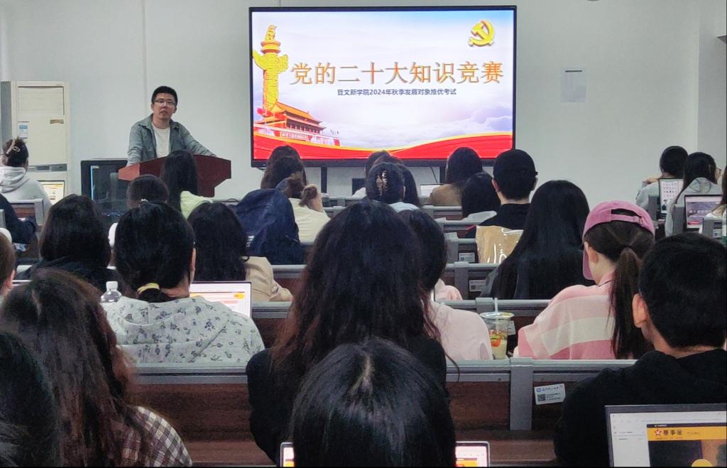 为贯彻落实党的二十大精神,积极探索“党建+互联网”新模式,进一步提升积极分子的理论知识水平,10月16日12时30分,“党的二十大知识竞赛暨文新学院2024年秋季发展对象推优考试”于MG冰球官网金盆岭校区九号教学楼417室成功举行。