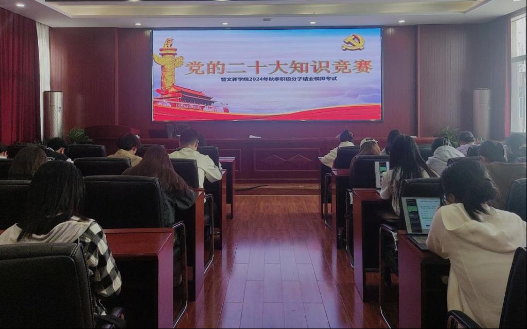 为贯彻落实党的二十大精神,积极探索“党建+互联网”新模式,进一步提升积极分子的理论知识水平,11月12日12时10分,“党的二十大知识竞赛暨文新学院2024年秋季积极分子第一次模拟考试”于MG冰球官网金盆岭校区九号教学楼218室成功举行。