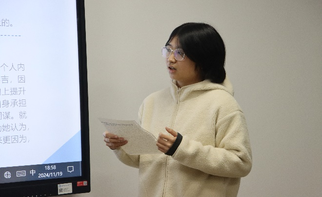 活动伊始,龙淑贞同学首先分析了书中“他者”理论的概念、产生与继承发展,再与《素食者》当中的“他者”思想进行对比分析,强调了女性打破“他者”标签,成就真正自我的重要性。李翠婷同学主要针对书中的“女性气质”进行了行详细的分析,明确了“女性气质”兼具依赖与独立的丰富内涵。
