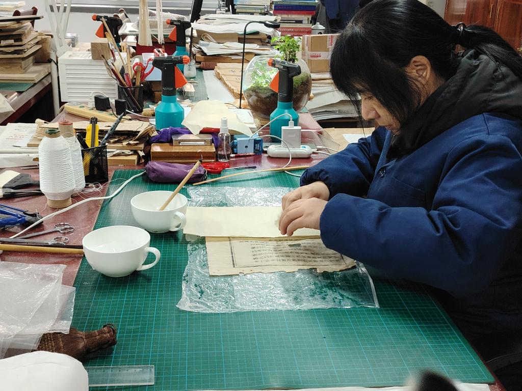 师生一行还参观了湖南省图书馆的古籍阅览室、古旧文献修复室,更进一步了解古籍修复工作。古籍修复工作的工序非常繁杂,需要全神贯注的投入,看到工作人员专心致志地从事古籍修复工作。我们体会到了湘图人赤心守护、潜心研究、匠心修复的初衷。