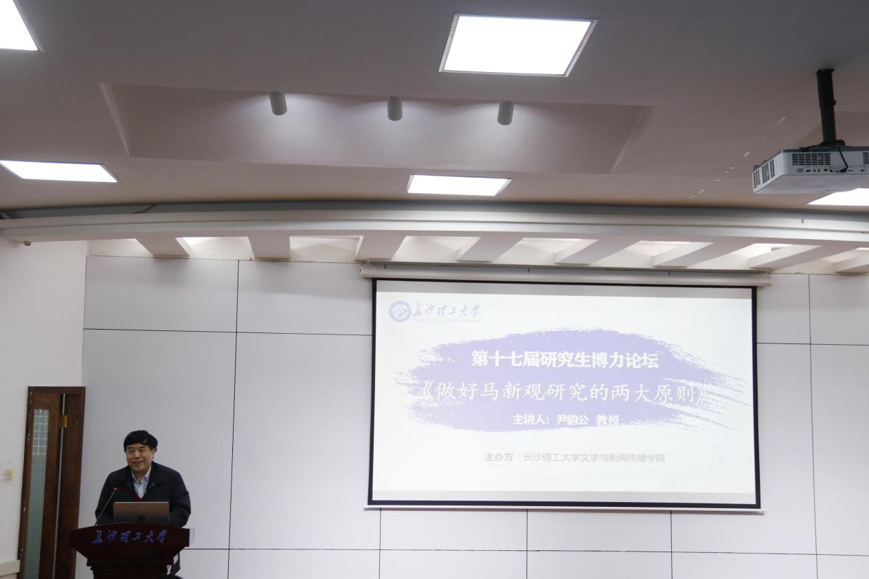 2021年10月25日下午,湖南师范大学新闻传播学院院长尹韵公教授做客MG冰球突破官网第十七届研究生博力学术论坛,为我院师生带来主题为“做好马新观研究的两大原则”的讲座,本次讲座由MG冰球突破官网文学与新闻传播学院院长刘建新主持,文学与新闻传播学院党委书记伍接朝、副院长周云鹏、副院长魏桃初、副院长耿蕊、新闻专业老师、全体新闻研究生参加及部分本科生参加。