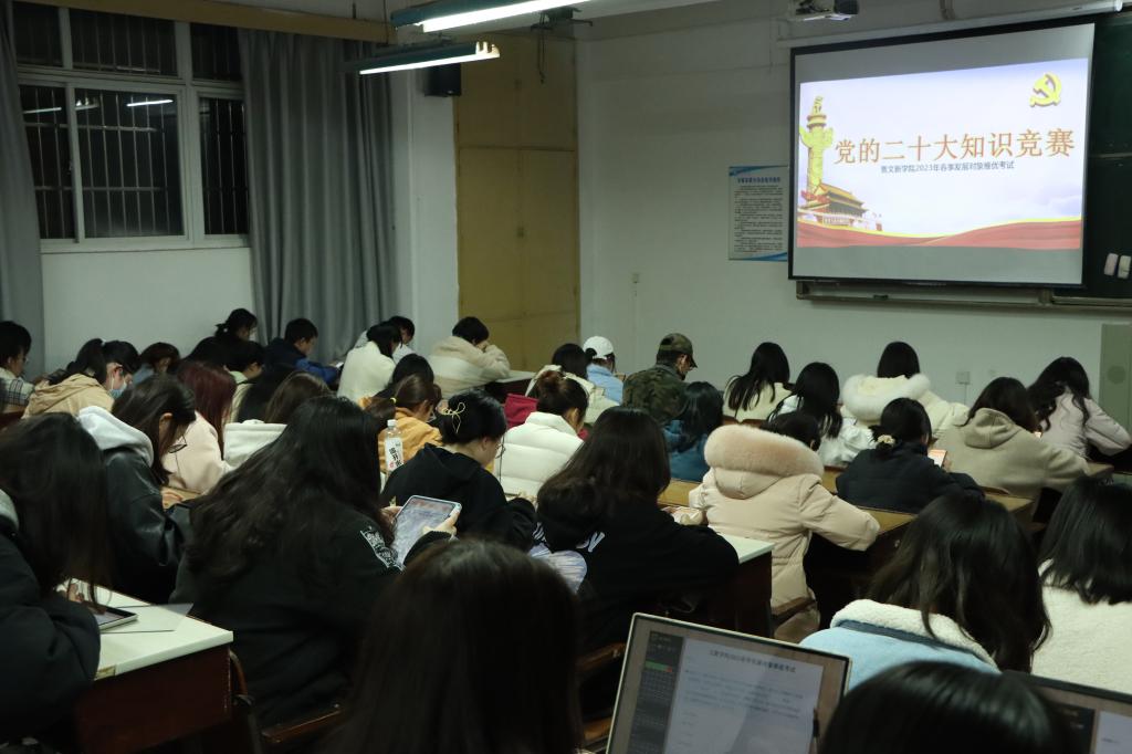 为深入学习与深刻贯彻落实党的二十大精神,积极探索“互联网+党建”新模式,进一步提升入党积极分子的理论知识能力水平,2023年3月28日晚7点30分,“党的二十大知识竞赛暨文新学院2023年春季发展对象推优考试”于MG冰球官网金盆岭校区三号教学楼成功举行。