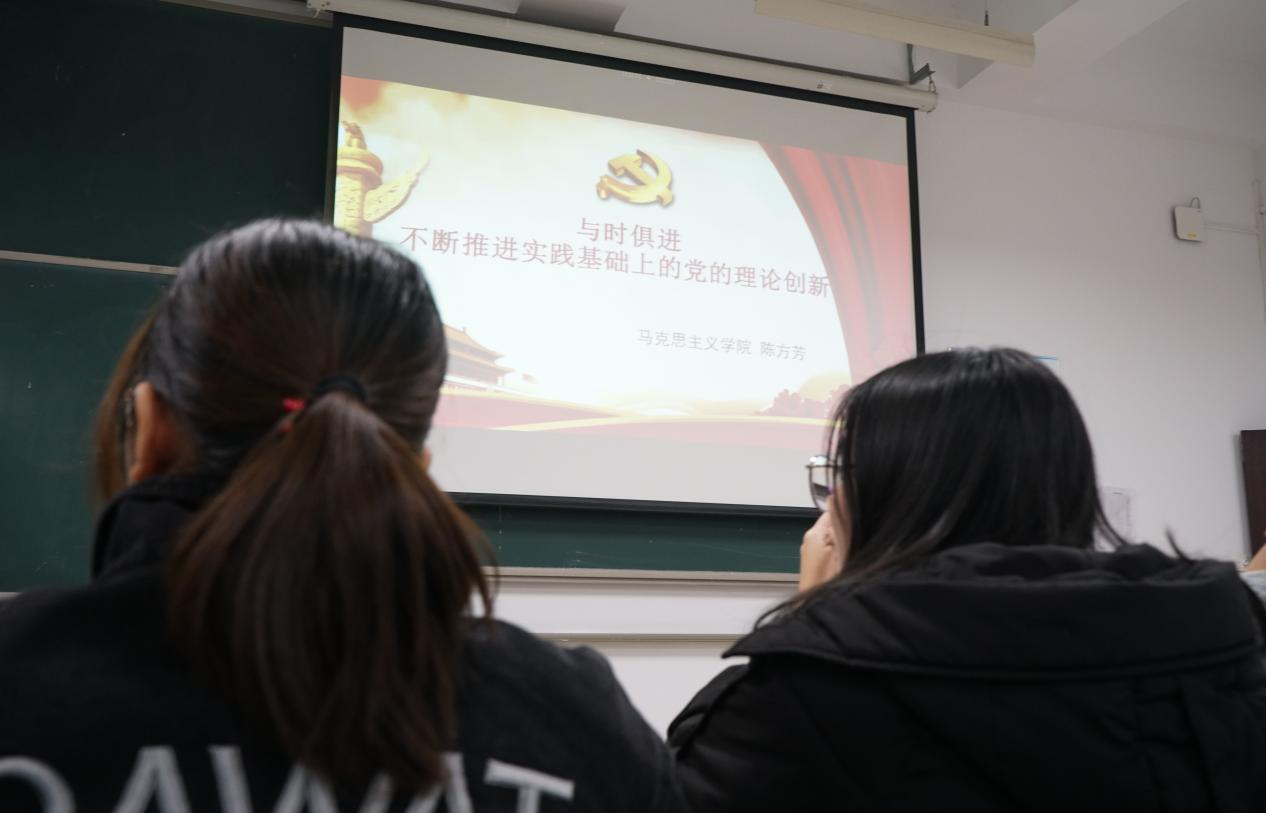119日1830,文学与新闻传播学院第38期入党积极分子培训班第三课《与时俱进不断推进实践基础上的党的理论创新》在三号工科楼A208教室举行。本次由马克思主义学院陈方芳老师授课。