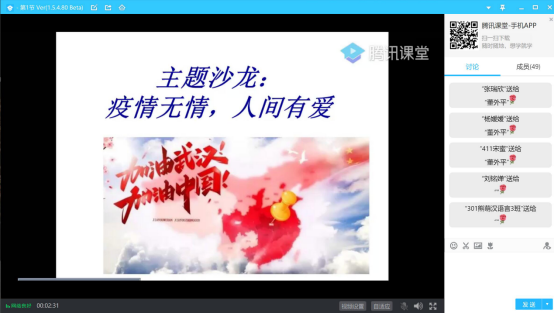 接着是会议的第二个主题,董外平老师邀请同学们分享对疫情的所思所感,在网络课堂,同学们积极发言,段晨嘉同学感慨道,“岁月静好,是因为有人在为我们负重前行,感谢那些在疫情中为我们奔赴前行的人,是他们用肩膀为我们承担了危险。我们要记住,我们是幸运的,因为我们只是被困在家里,但有些人却被永远地困在了2020。我们应该铭记他们。”