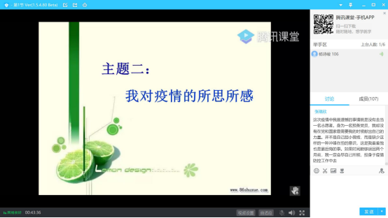 首先老师讲述了今天研习活动的三个主题,分别是“我所经历的疫情故事”,“对疫情的所思所感”和“疫情之后如何重建新生活”。在第一个主题,董外平老师讲述了六个关于抗疫的暖心故事,同时邀请参会同学一起分享,参会同学通过语音发言和文字的形式积极参与讨论,平凡之间得见伟大,通过这些故事的分享,让同学们再一次学习到了团结和责任的力量。