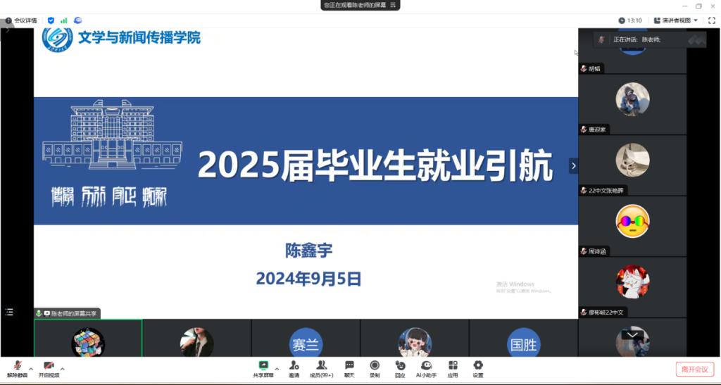 为进一步提高学院就业指导工作质量,引导毕业生了解就业形势,树立正确的就业价值观,积极就业,理性择业,我院于9月5日晚在腾讯会议线上召开2025届毕业生就业引航大会。会议由院学生党总支副书记、2025届就业专干陈鑫宇主持,全体2025届毕业生参加此次线上会议。