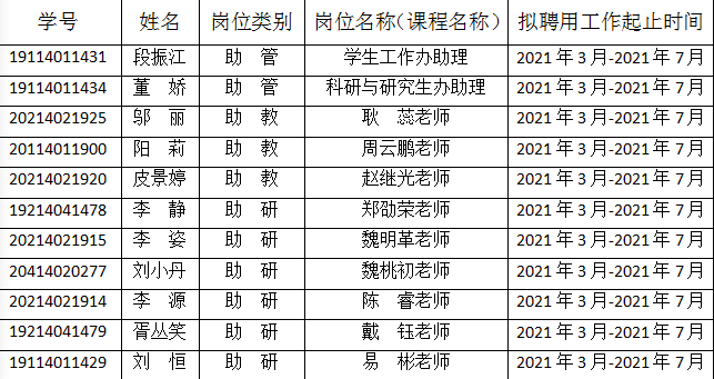 根据MG冰球突破官网研究生“三助一辅”工作管理办法,经自主申报、导师推荐、设岗单位同意、学院审核,现将2020-2021学年第二学期拟聘用研究生“三助一辅”岗位名单公示如下: