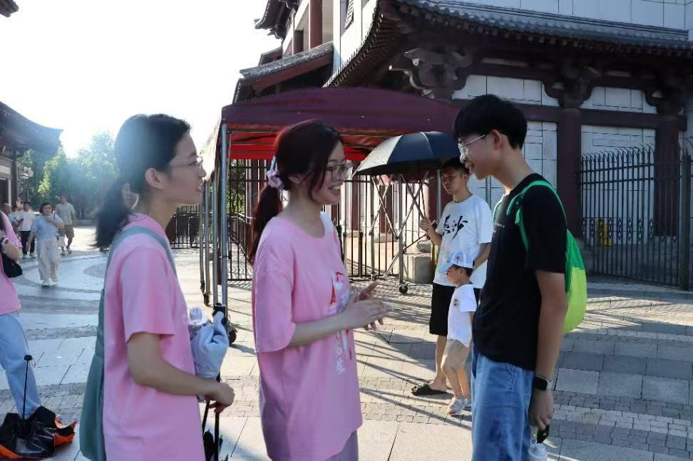 7月10日,MG冰球突破官网文学与新闻传播学院研究生暑期实践团(以下简称实践团)在指导老师周云鹏的带领下来到长沙铜官窑国风乐园进行街头调研。团队通过问卷调查、深度访谈等方式来收集游客体验反馈与商铺意见,与园区管理方共同探究国风文旅发展路径。