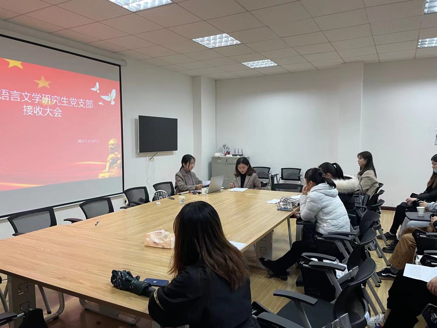 3月17日晚7点,中国语言文学研究生党支部于金盆岭校区7教306召开预备党员接收大会。会议由曾铭汇同志主持,党支部书记李敏及支部全体成员参加大会。