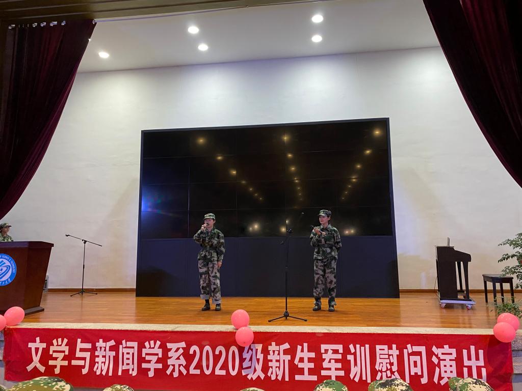 9月25日晚,文新系2020级师生在MG冰球突破官网金盆岭校区校友之家举办军训慰问演出。文学与新闻学系党总支书记伍接朝,系副主任周云鹏、魏桃初,系党委委员、中文系主任郑劭荣老师,系学工办主任、17级辅导员楚艳鸽、系团委书记吴笛以及2020级新生辅导员李敏到场。