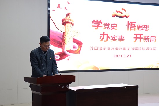 仪式上,院长段胜峰宣读《中共MG冰球突破官网外国语学院委员会关于开展党史学习教育的实施方案》并讲话。段胜峰指出,开展党史学习教育是推进中华民族伟大复兴历史伟业的必然要求;是坚定信仰信念,在新时代坚持和发展中国特色社会主义的必然要求;是推进党的自我革命、永葆党的生机活力的必然要求,三个必然要求,足以彰显党史学习的重要性。关于如何做好学院党史学习教育,他提出了三点要求:大家要深刻认识到党史学习教育的重大意义,增强政治自觉;要准确把握党史学习的目标要求,做实做细做小;要精心设计党史学习教育的方法步骤,确保学习成效。最后他强调,具体工作中要坚持对标对表,将学习抓到实处,把握主题主线,将办实事落在实处,突出特点亮色,创新创活。