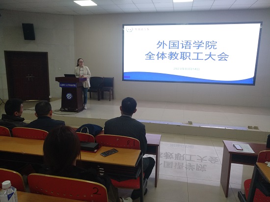 3月14日下午,外国语学院在云塘校区文科楼圆厅A-100学术报告厅召开学院教职工大会,通报学院党委班子2022年度民主生活会召开情况。学院党政导班子成员、全体教职工参会,大会由院长段胜峰主持。