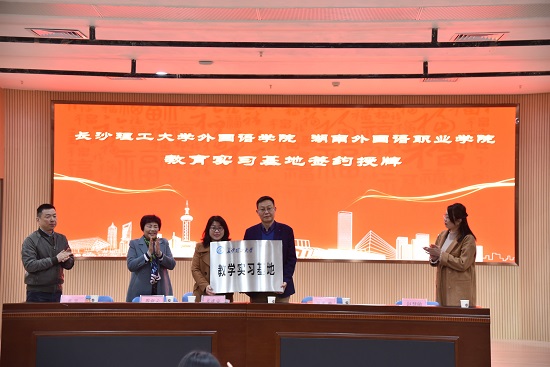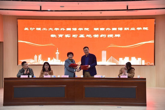 为促进MG冰球突破官网英语专业人才培养和学生教育实习,2021年3月22日,MG冰球官网外国语学院院长段胜峰教授、副院长黄坚教授、外国语言文学系主任胡伟副教授和副主任姚尧博士一行赴湖南外国语职业学院,举行教育实习基地签约与挂牌仪式。