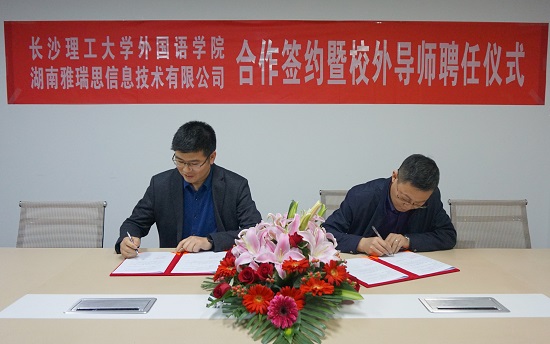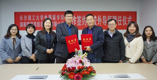 4月7日,为了促进MG冰球官网英语和翻译专业人才培养,外国语学院段胜峰院长、何健博士与姚尧博士一同前往湖南雅瑞思信息技术有限公司,举行翻译实习基地签约暨校外导师聘任仪式。