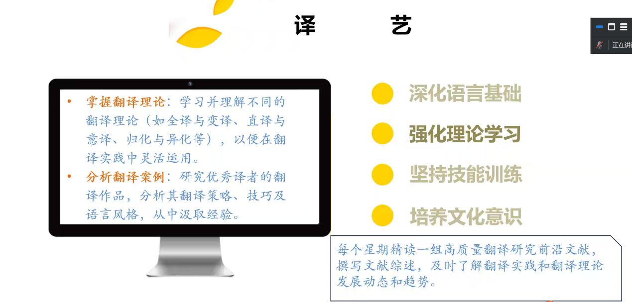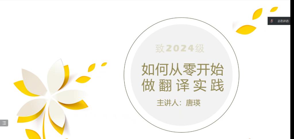 2024年9月5日上午,外国语学院特邀唐瑛老师为24级硕士研究生新生开展了主题为“从零开始做翻译实践”的线上专题讲座,旨在为新生们提供一个清晰的翻译实践入门指南,引导他们认识翻译实践的重要性,并为他们今后的学术研究和职业发展打下坚实的基础。