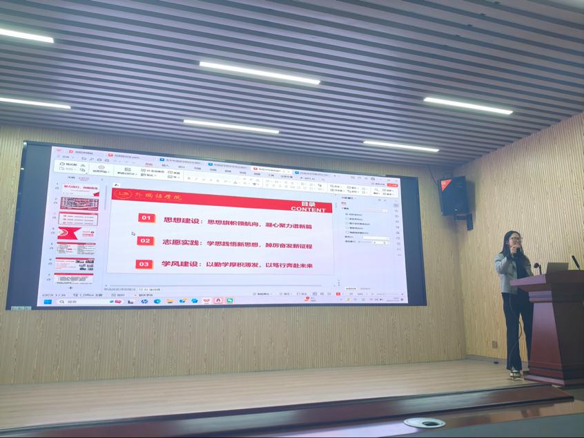 本次大会分为班级展示,总结点评两个环节。在班级展示部分,英语2201班、英语2301班和翻译2201班的班长分别从班级概况、学风建设、班风建设、社会实践、班级荣誉等方面进行了先进班集体竞选答辩,表述清晰有力。