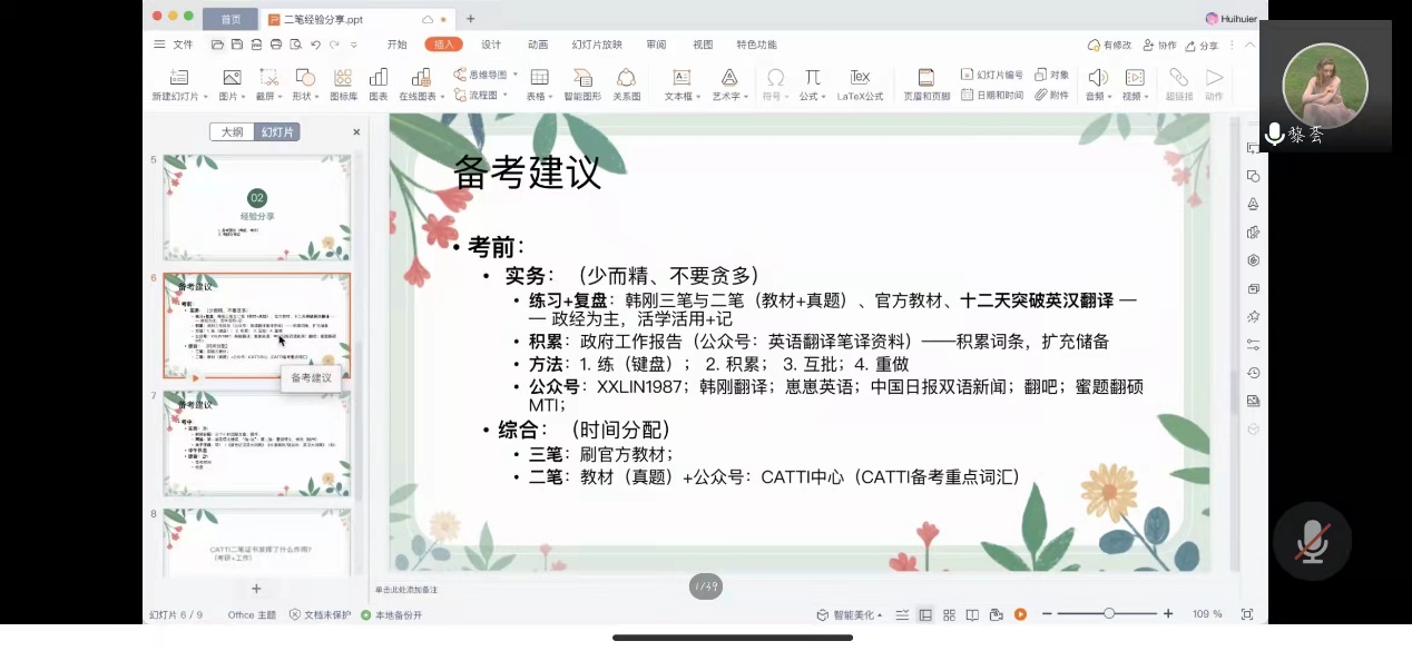 翻译1702班毕业生黎荟就CATTI考试进行了经验分享。她分考前和考中两个阶段就如何备考三级笔译和二级笔译给19级同学们提供了一些建议。她特别提到,同学间要互帮互助,鼓励同学们在备考三笔和二笔时主动寻求身边同学的帮助,互相借鉴,共同进步。