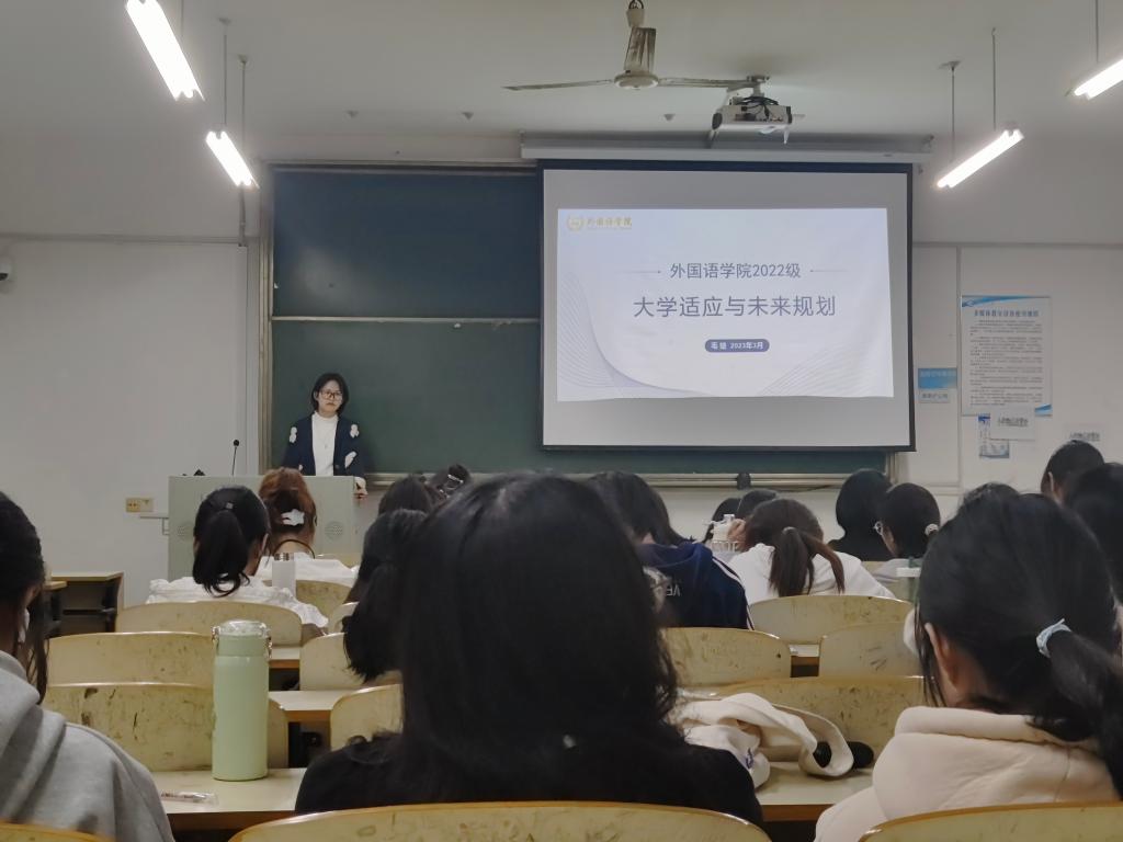 3月8日晚19:00,为提高大一新生适应能力,明确未来发展方向,我院在金盆岭7号教学楼面向2022级全体本科生召开主题为“大学适应与未来规划”的年级大会。本次大会在年级辅导员毛婕的主持下有序进行,内容涵盖大学生角色适应,学习适应,生活适应,人际适应,转专业辅修双学位解读,大学规划等多方面内容。