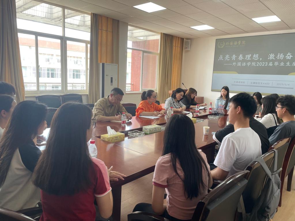 2023年5月4日上午10:30,我院于云塘校区文科楼A603召开外国语学院2023届毕业生座谈会,学院党委书记文丽丽、院长段胜峰、院党委副书记周芳、副院长季红琴、学工办主任武巧琳、毕业班辅导员龙洋出席座谈会,学院19级毕业生代表10人,20级学生代表5人参加此次座谈会。