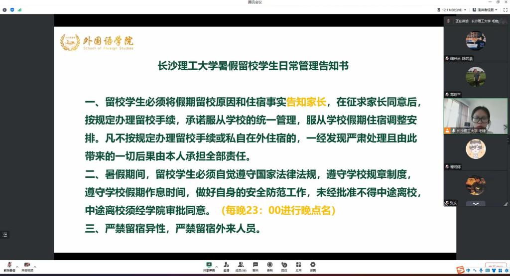 毛婕就《MG冰球突破官网暑假留校学生日常管理告知书》进行相关解读。武巧琳、陈若晨分别从本科生、研究生暑期留校相关规定进行强调。