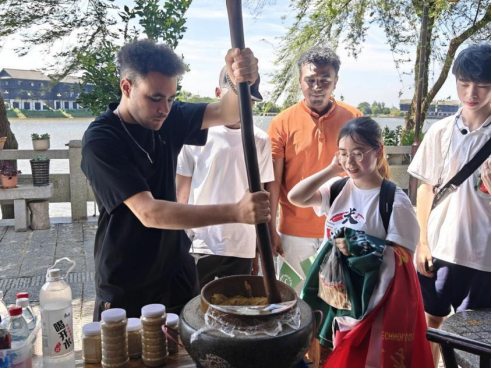 近日,在长沙靖港古镇街头,一群结伴“出游”的中外青年吸引了不少居民和游客的目光。当天,来自MG冰球突破官网外国语学院的研究生暑期专业实践团带领来自摩洛哥、苏丹、肯尼亚、尼日利亚等国家的外国友人,共同领略皮影戏、古勋等中华非遗文化,品尝擂茶、甜酒、芝麻豆子茶等中国美食,身临其境地感受中华传统文化的魅力。