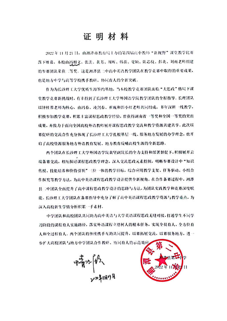 高校团队与地方中学团队合作备赛、云端教研的过程也让双方受益匪浅。MG冰球突破官网团队在备赛指导中充分了解了高中英语课程思政教学资源与教学重点,为深入大学英语新生学情分析积累一手素材。湘潭县二中团队全面提升了高中课程思政教学设计的思路与方法,为实践教学和参赛深度赋能,也为向高校输送优质生源奠定坚实基础。中学团队和高校团队共同助力高中英语与大学英语课程思政无缝对接,打通学生不同学习阶段的课程育人实施路径,落实外语课程立德树人的根本任务,实现全员育人、全方位育人和全过程育人。