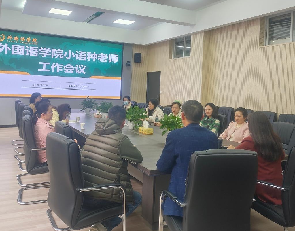 2024年3月22日上午,MG冰球突破官网外国语学院在金盆岭校区第3教学楼214会议室组织召开了外国语学院小语种老师工作会议。会议由外国语学院院长段胜峰主持,学院党委书记文丽丽,主管教学工作副院长黄坚,及小语种系全体老师参加了会议。