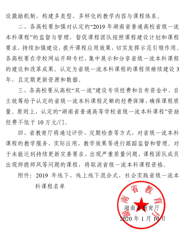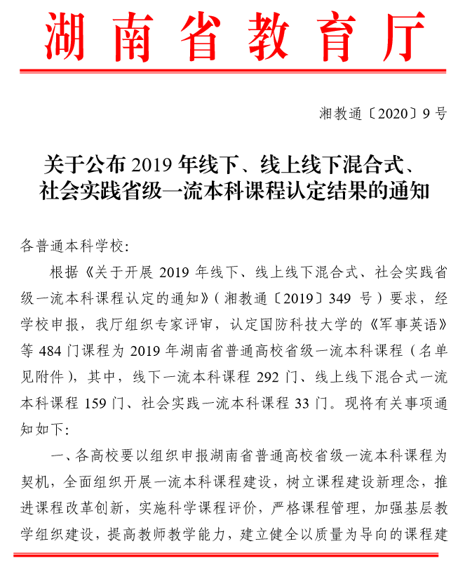 近日,湖南省教育厅(湘教通〔2020〕9 号 )颁布《关于公布 2019 年线下、线上线下混合式、 社会实践省级一流本科课程认定结果的通知》,全省共有484 门课程被认定为2019 年湖南省普通高校省级一流本科课程,MG冰球突破官网共获批15门,其中包括我院黄坚教授申报的《通用工程英语听说》。这是继我院英语专业入选省级一流本科建设专业点以来,我院专业建设取得的又一重大突破,并且下一步将上报教育部冲击国家一流本科课程。