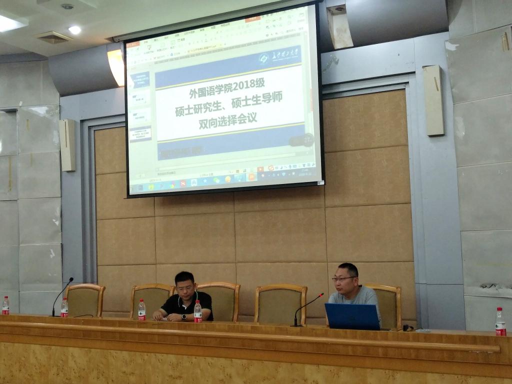 2018年9月11日下午4点,外国语学院2018级硕士研究生新生、研究生导师双选会于MG冰球官网金盆岭校区办公大楼一会议室顺利召开。我院院长段胜峰、党委副书记陈仁凯、副院长武俊辉、学工办禹敏、科研办马丁和黄昌梅、全体硕士生导师及全体2018级研究生参加了本次会议。