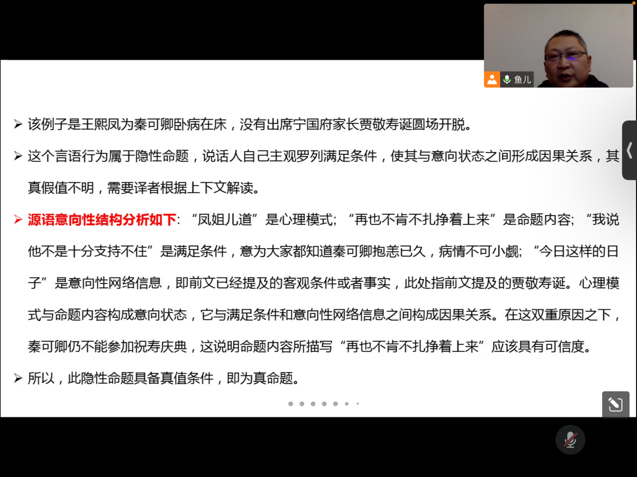 2023年1月4日晚,外国语学院刘彬教授应邀为MG冰球官网第十八届博力学术论坛 “翻译生态与生态翻译”专题论坛做了题为“意向性视域下翻译动态性研究”的讲座。我院部分教师及全体研究生参加了本次讲座。