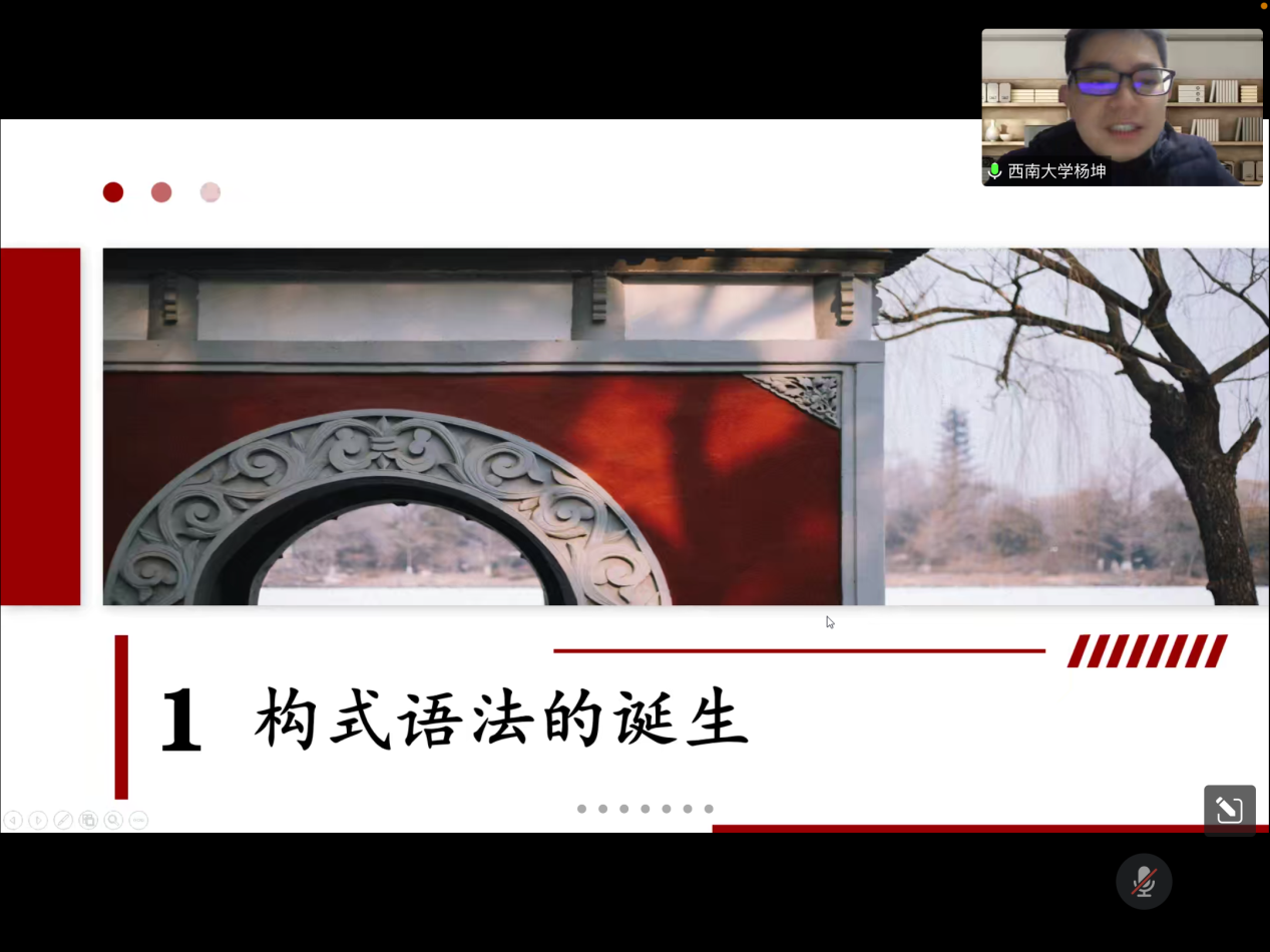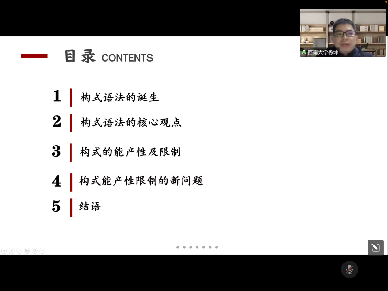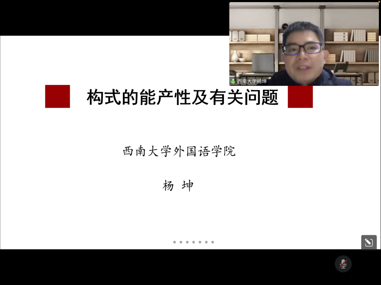 2022年12月13日晚,西南大学外国语学院杨坤教授应邀为MG冰球官网第十八届博力学术论坛 “翻译生态与生态翻译”专题论坛做了题为“构式能产性及有关问题”的讲座。外国语学院部分导师及全体研究生参加了本次讲座。
