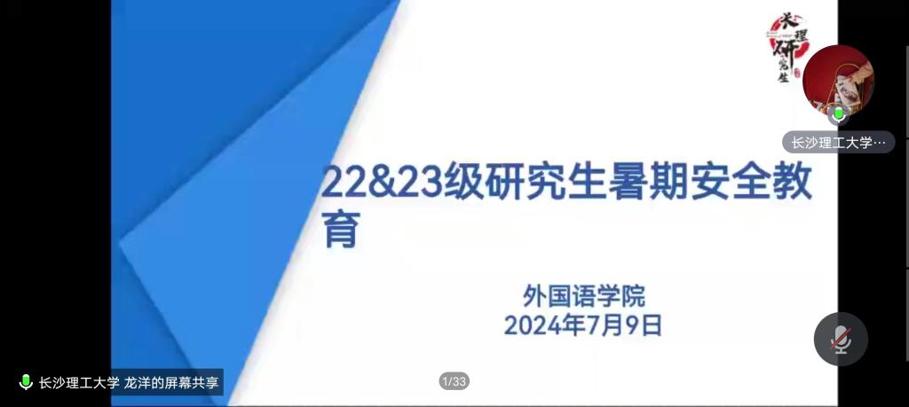 7月9日晚,外国语学院于线上召开了全体研究生暑期安全教育大会,研究生辅导员龙洋出席会议并发表讲话。