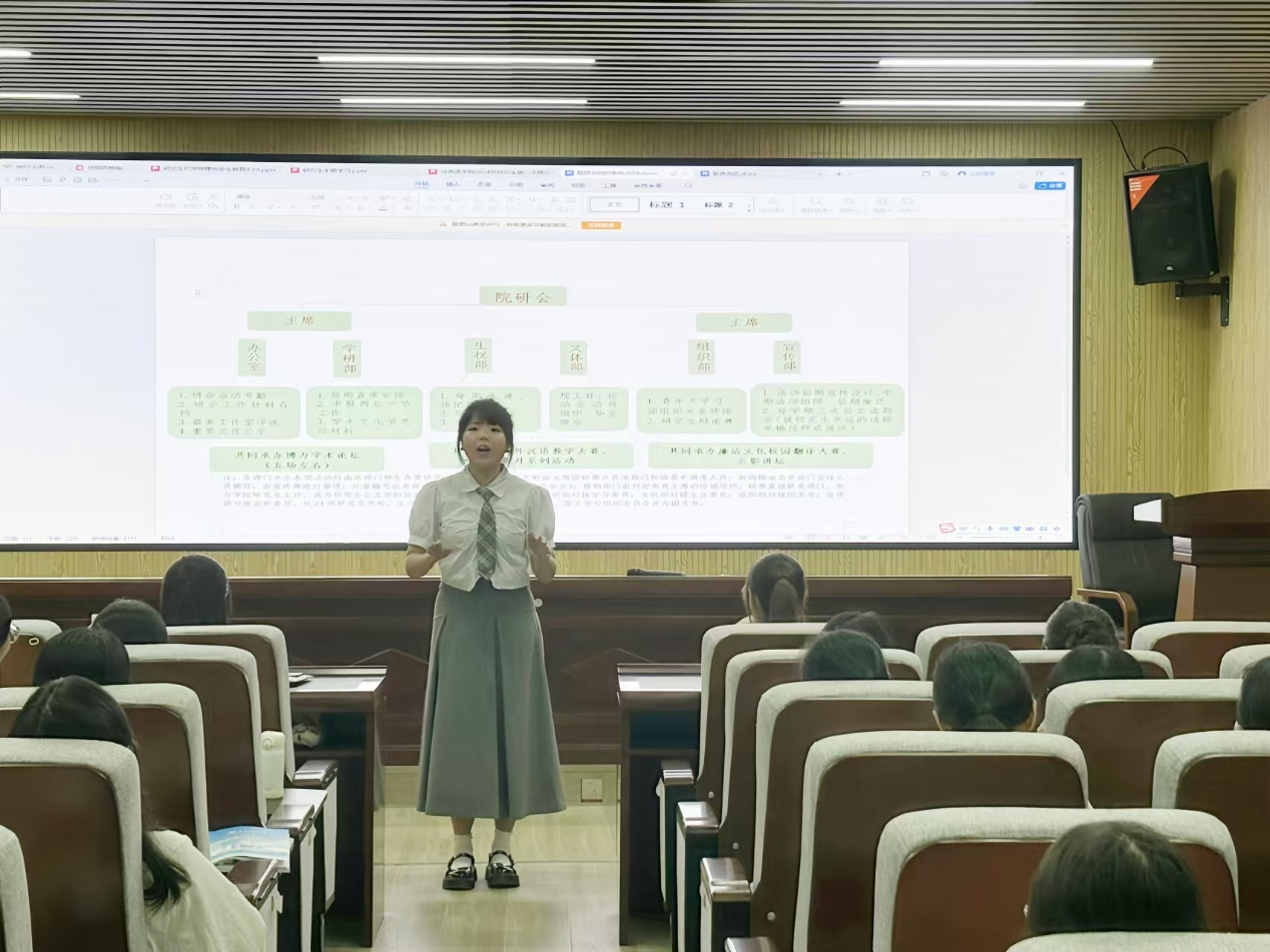 接着,邹嘉怡领学了《研究生手册》,她重点介绍了学术规范与行为要求,其中包括研究生学业奖学金评审办法,并鼓励同学们认真学习手册内容,严格遵守相关规定,顺利完成学业。