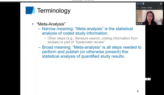 张小娟首先对MA作了简要介绍,让同学们对此概念有所了解。对于撰写论文,张小娟强调理论要有意义,需要足够的文献做支撑,需要一定程度的创新。同时,就如何进行语言分析给出了建议:第一步,通过阅读文献提出研究问题;第二步,检索目标文献;第三步,把文献进行编码;第四步,分析结果的影响因素。张小娟主要介绍了方程式计算数据的应用方法,如何计算对照组的均值和方差,存在什么样的变量或总的平均差。在提问环节,张小娟也详细认真地解答了同学们提出的问题。