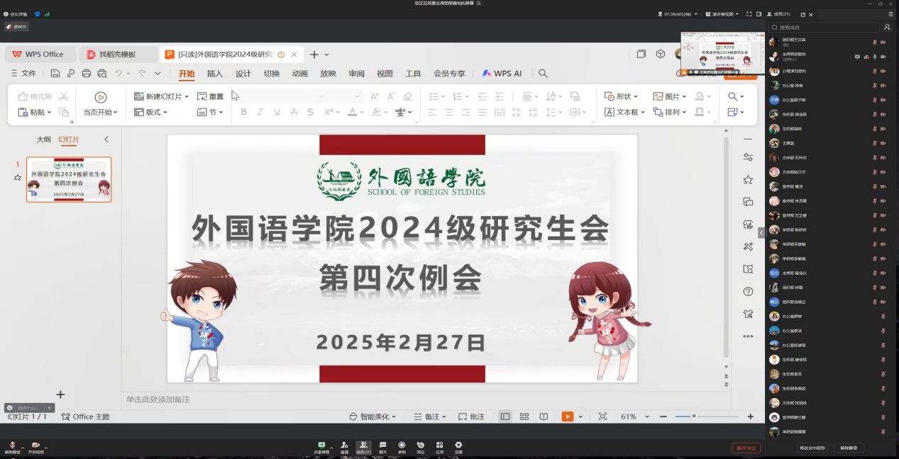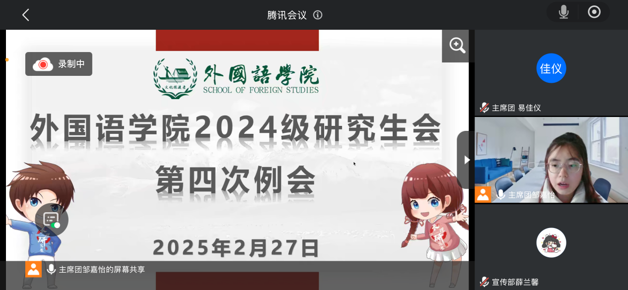 为推动本学期外国语学院研究生会工作顺利进行,2月27日下午3点,外国语学院于线上召开了2024级研究生会第四次例会。本次会议由院研会轮值主席邹嘉怡主持,研会全体干部参会。