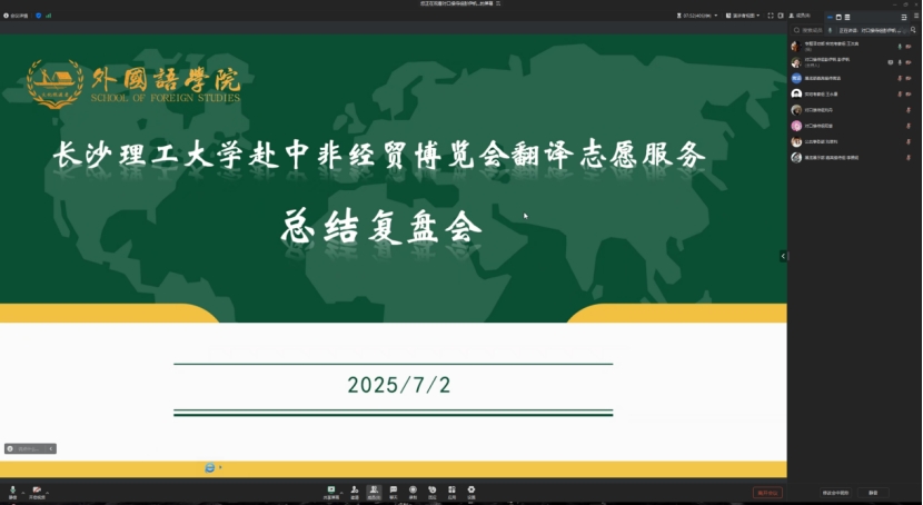 为构建更为专业的涉外服务体系、提升后续志愿服务效能,7月2日晚8点,MG冰球突破官网外国语学院组织召开第四届中非经贸博览会研究生暑期专业实践团翻译志愿服务总结复盘会,围绕6月12日至15日服务工作展开全面总结。各岗位实践团成员在会上热烈交流,回顾了四天高强度的服务历程。