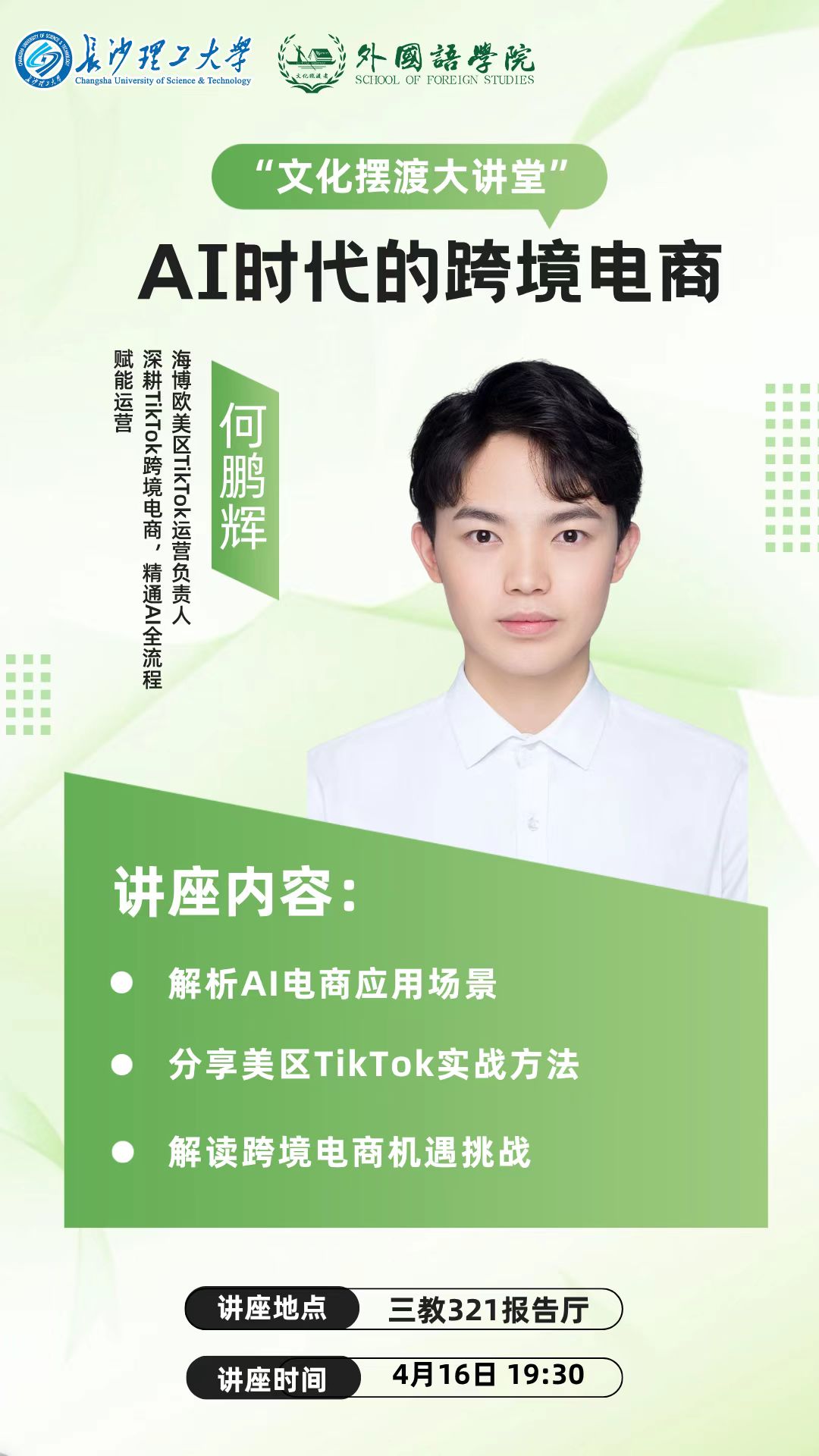 【主要内容】:本次讲座将聚焦人工智能技术与跨境电商行业的深度融合,解析 AI 在市场分析、选品决策、智能客服、流量投放、内容生成等核心环节的应用场景;结合美区 TikTok 电商生态,分享 AI 驱动的短视频运营、直播转化、流量精准获取等实战方法;解读 AI 时代跨境电商的新机遇、新规则与新挑战,为从业者与学习者提供可落地的运营思路与成长路径。