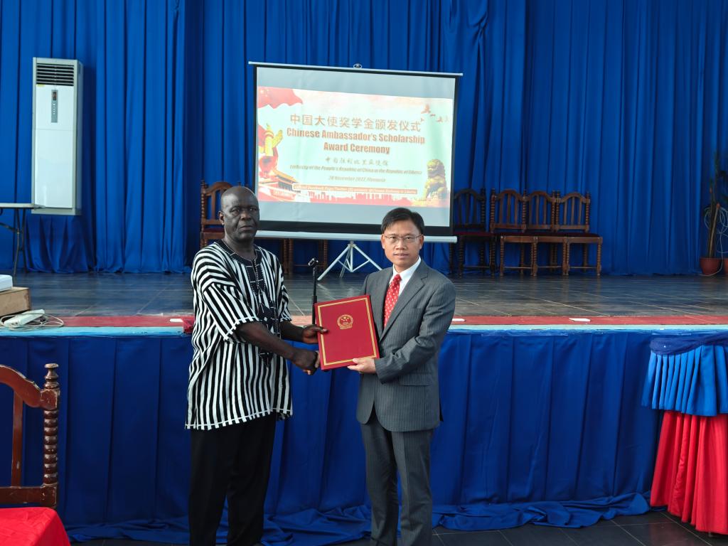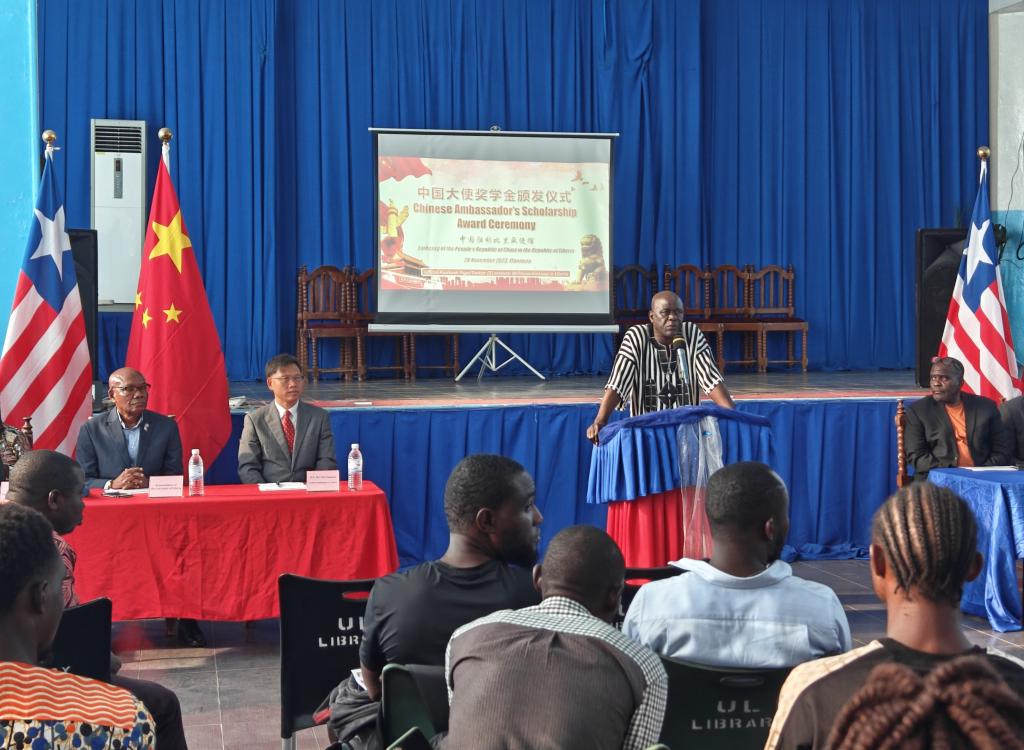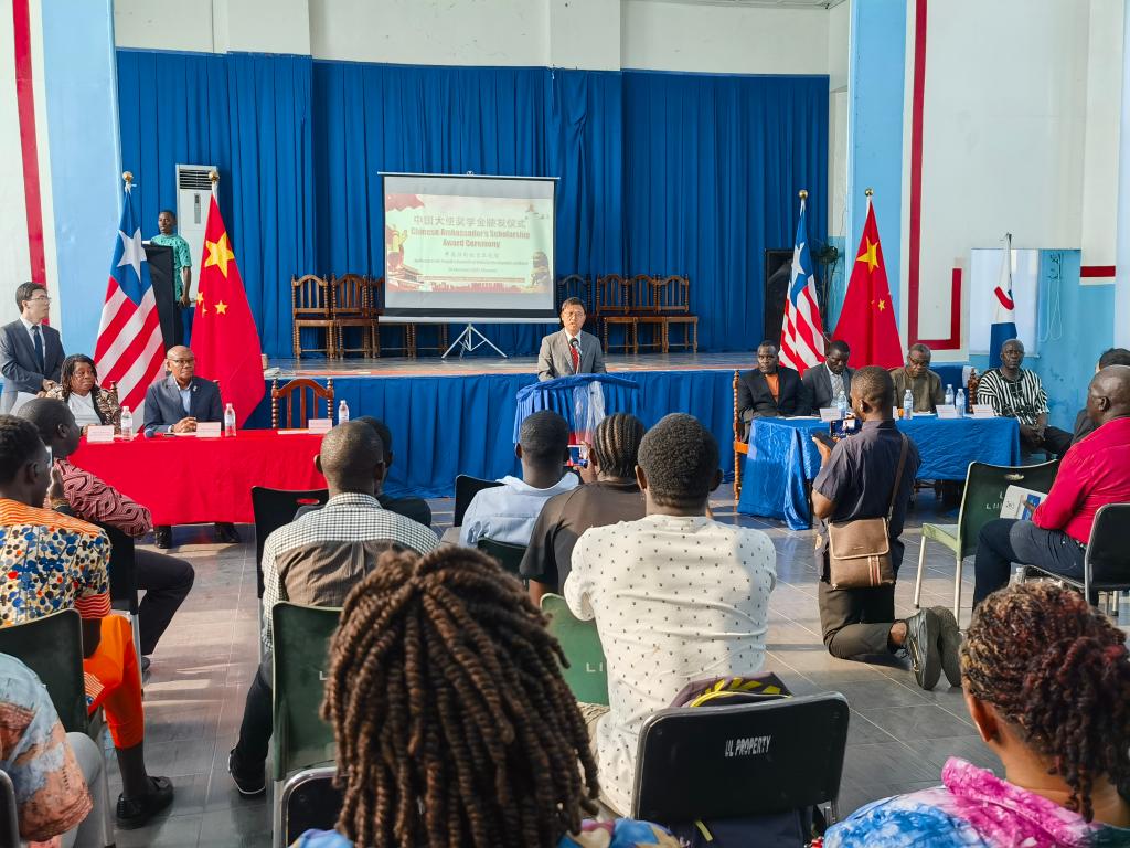 尹承武大使在致辞中首先向获奖的131名同学表示热烈祝贺。他说,“中国大使奖学金”的设立调动和激励了利比里亚学生努力学习知识技能、了解中国、学习汉语的热情,助力他们实现人生梦想,也为两国关系发展播下希望的种子。尹大使指出,利大孔子学院迄今为止,已经培养了一大批了解中国语言文化的学员,也为中资企业输送了数百名中文人才,已成为中利教育合作的又一块招牌。他祝愿中利两国越来越多的年轻人相知相亲,学习了解彼此的语言和文化,成为两国友好的新一代使者。