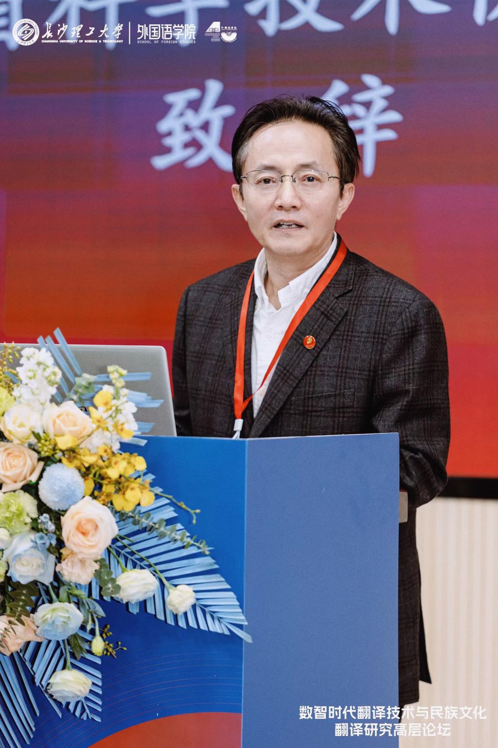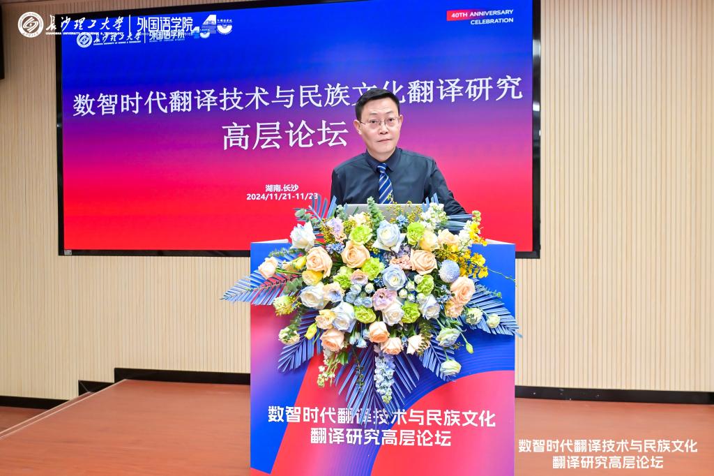 湖南省科学技术协会党组书记王瑰曙向与会的专家学者表示欢迎。他指出,当前全球科技革命和产业变革加速演进,科技创新战略布局深度重构。本次论坛以“数智时代的翻译技术与民族文化翻译研究”为主题,意义深远。希望借此汇聚各方智慧力量,加强协同联动,推动创新创造,在创新组织培育、科技资源共享等方面发力,吸引更多创新资源和人才汇聚湖南,为实现“三高四新”美好蓝图提供支撑,推动我国翻译事业蓬勃发展与文化传承创新。