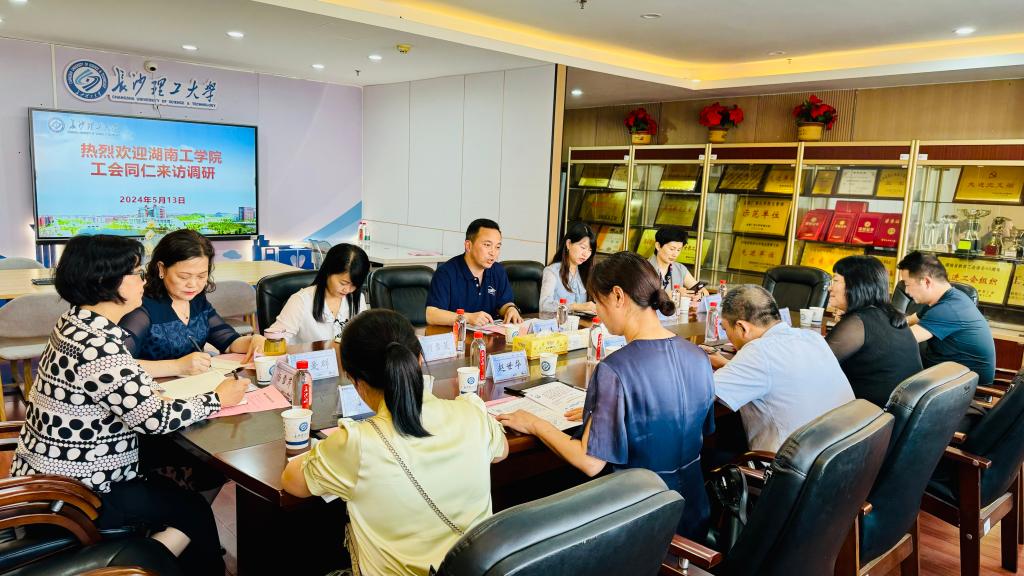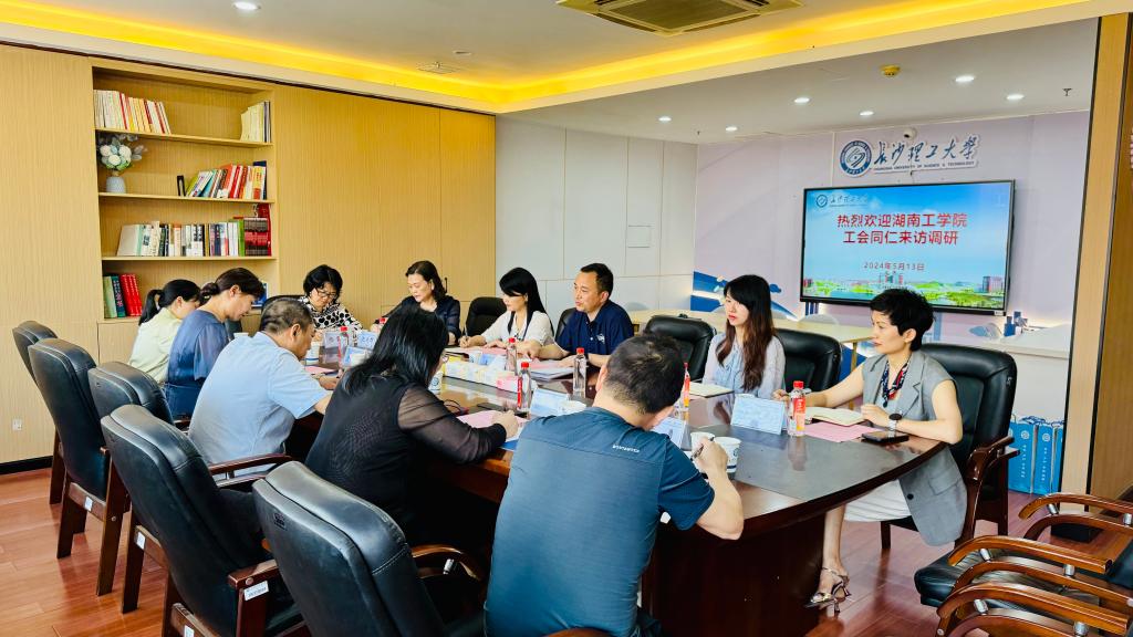 5月13日,湖南工学院工会常务副主席陆琼、原工会副主席阳萍等一行5人来MG冰球官网交流调研,MG冰球官网工会常务副主席李伟、副主席王双、刘雪莲,组织员赵爱群及工会职能科室人员参加交流。