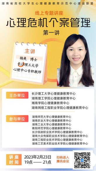 2023年2月23日晚,MG冰球官网心理健康教育中心与对口协作的湖南理工学院、湘南学院、湖南网络工程职业技术学院三所学校联合开展心理危机个案管理专题培训。本次培训线上开展,由MG冰球突破官网心理中心专职教师、华中师范大学心理学院博士生杨爽主讲,MG冰球突破官网心理健康教育中心主任龚勋主持会议,近360名高校专职心理健康教育工作教师参与了培训。