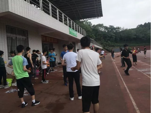 每名参与者配备水枪,披好雨衣,互相喷水,不作比赛,只为开心。